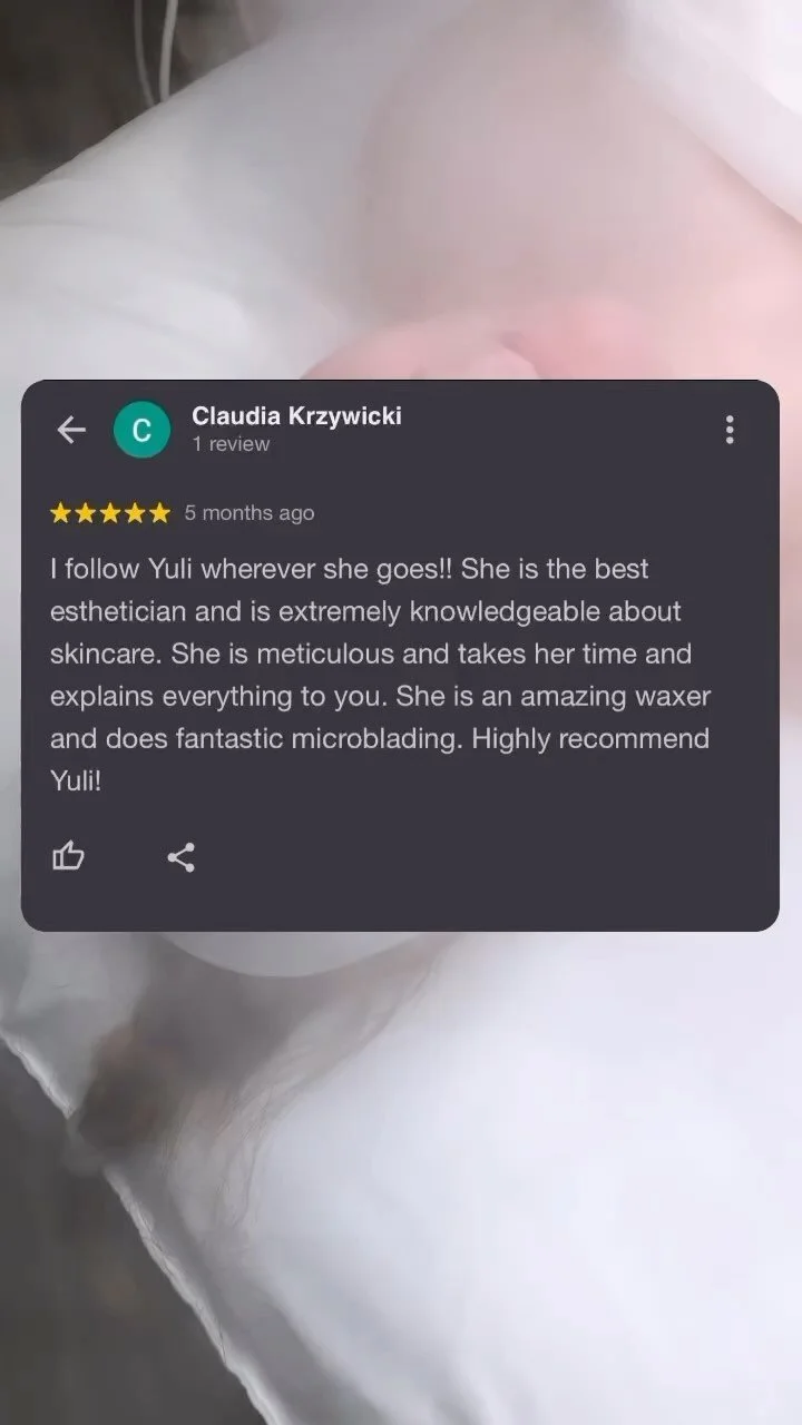 I have been going to Yuli for over 2 years now and my skin has never looked and felt healthier! She pays attention to detail and provides a warm comfortable setting. The products she offers are the best on the market and they really work!”